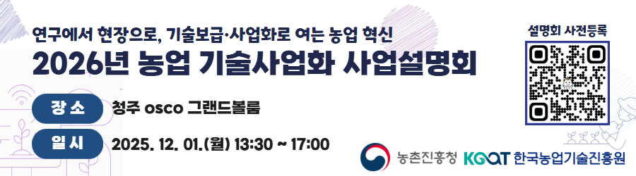 2026년 농업 기술사업화 사업설명회가 12월 1일(월),13:30 부터 청주 오스코에서 개최됩니다.